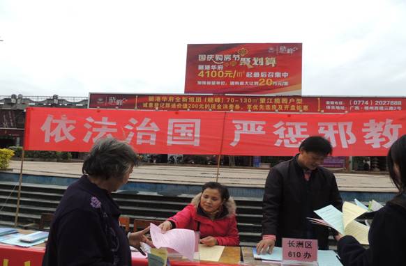12月4日是第一个“宪法日”,又是“全国法制宣传日”。为了响应梧州市委政法委的号召,以及梧州市防范和处理邪教问题办公室(梧州市610办)结合“宪法日”、“法制宣传日”和梧州市反邪教宣传周开展反邪教宣传活动的要求,12月4日,长洲区委政法委、长洲区防范和处理邪教问题办公室(长洲区610办)在鸳江丽港广场开展了反邪教法制宣传活动。宣传活动通过张挂宣传标语、接受群众咨询、展出展板和图片,发放宣传资料等形式进行宣传。活动共张挂反邪教宣传横幅2条,展出展板3块、图片10多幅,接受50多名群众咨询,发放了《刑法》、《治安管理处罚法》等法律法规和《崇尚科学 反对邪教》等宣传资料500多份。