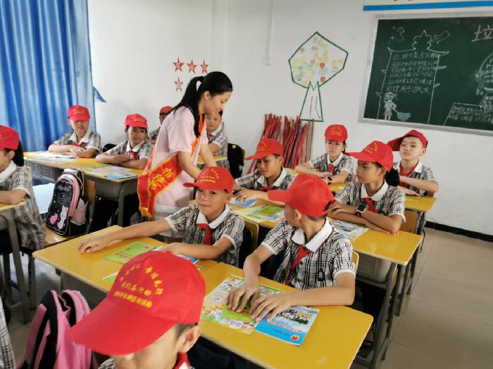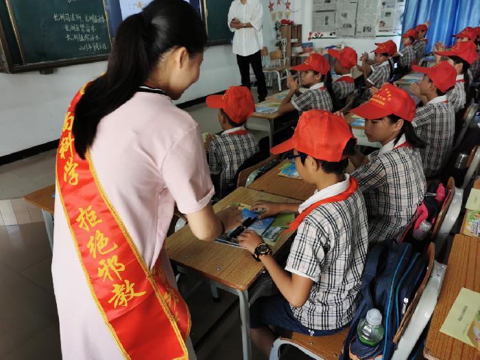 志愿者向学生讲解反邪教、禁毒和提示群众安全感知识