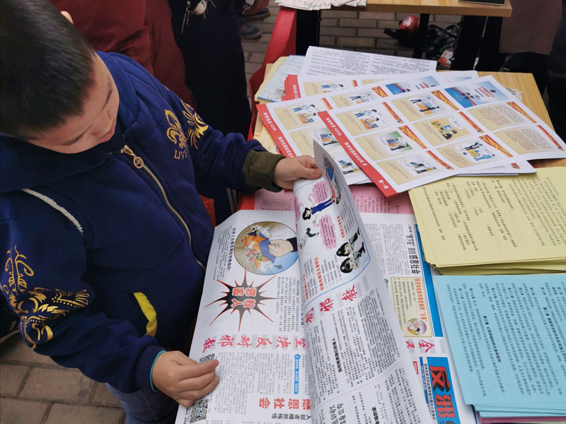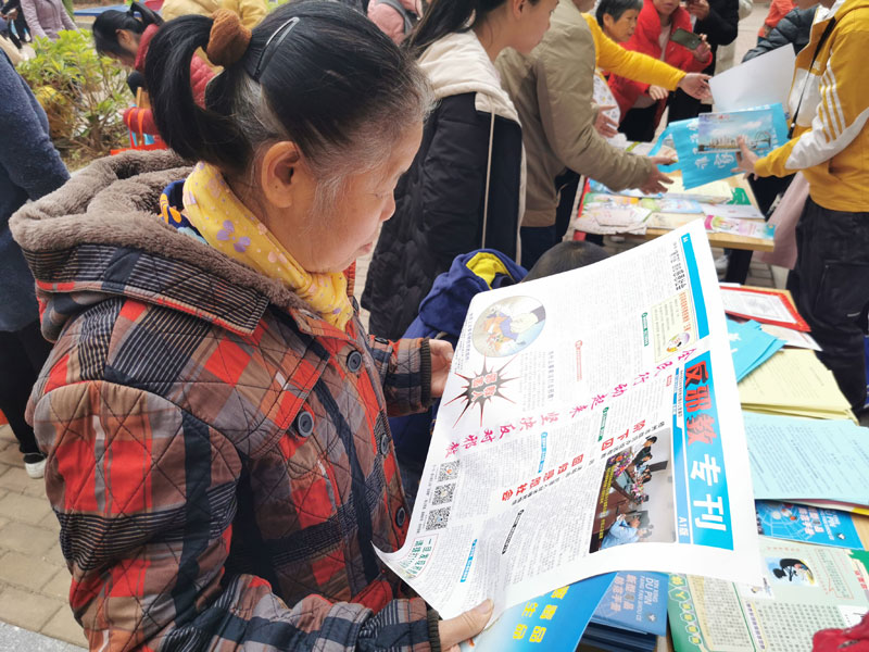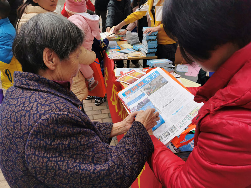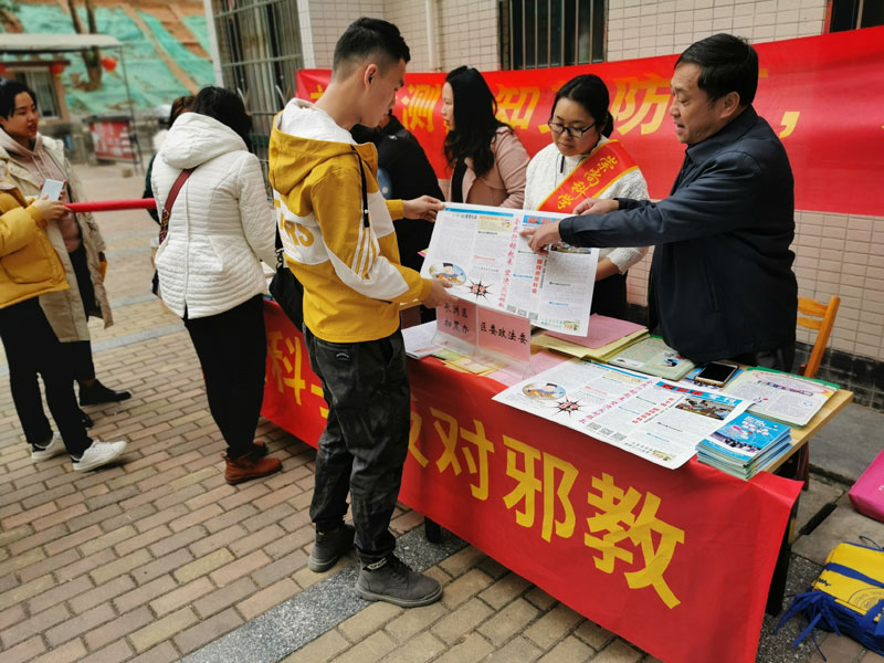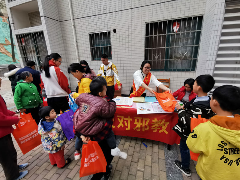 反邪教志愿者向群众派发宣传礼品
