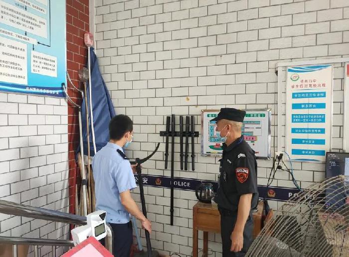 为进一步加强考场安全管理,消除各类安全隐患,筑牢校园安全防线,警员对学校一键式报警、监控设施、消防器材及安保防爆器械等设施设备进行检查,对发现的问题隐患进行跟踪督促整改。